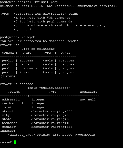 • Create an appropriate user, for example “myob” (as set by default in the refresh.pl “Primary configuration variables”) (CREATE USER myob WITH PASSWORD myob)