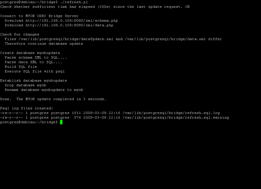 • To set Linux to run refresh.pl at regular interval adjust the postgres cronfile accordingly (crontab -e)