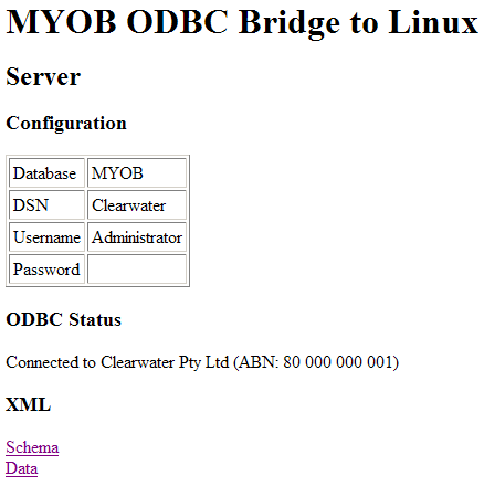 • Load ./index.php in your web browser, and you should see the “MYOB ODBC Bridge to Linux” page as shown above in Screen Shots.